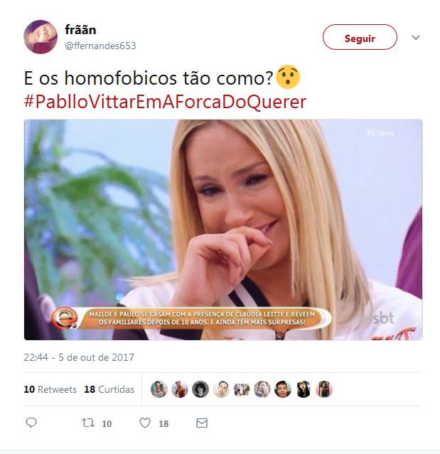 A participação da cantora Pabllo Vittar em “A Força do Querer”, nesta quinta-feira (5/10), confirmou o sucesso da artista. Enquanto aparecia no folhetim das 21h, escrito por Glória Perez, a #PablloVittaremAForçadoQuerer esteve entre os assuntos mais comentados do Twitter.