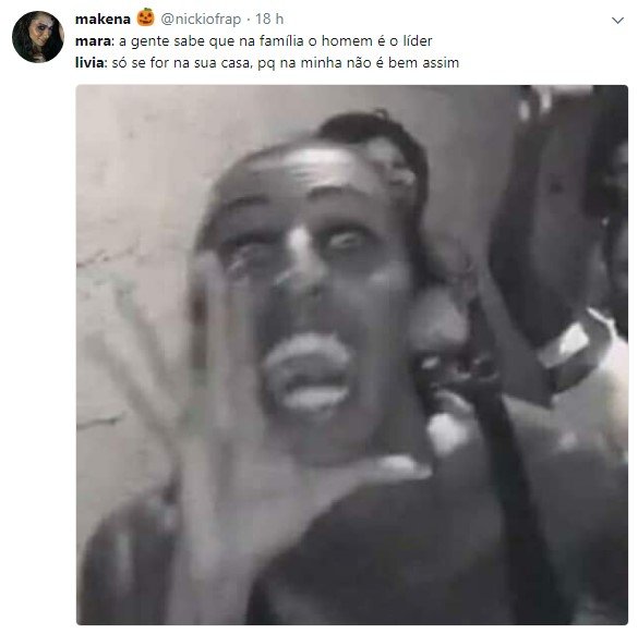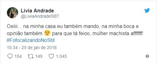 No Twitter, Lívia também mandou um recado para Mara. “Oxi. Na minha casa eu também mando, na minha boca e opinião também. Para que tá feio, mulher machista”, disparou.