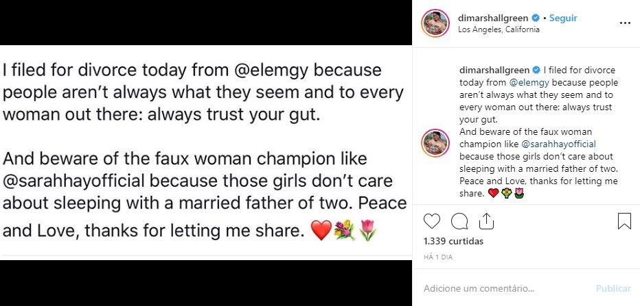 Os dois estavam casados desde 2012 e tem um filho, Tenesse Logan. Junto à revelação da infidelidade, Diane também confirmou que decidiu-se pela separação. “Entrei com um pedido de divórcio hoje pois as pessoas nem sempre são o que aparentam. E para as mulheres todas que estão por aí: confiem em seus instintos sempre. E cuidado com falsas campeãs como @sarahhayofficial porque esse tipo de garota não se importa em dormir com um homem casado, pai de duas crianças. Paz e amor, obrigada por me permitir compartilhar isso”.