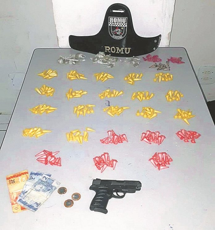 A Ronda Ostensiva Municipal (Romu) deteve um homem, na noite de terça-feira (24), quando realizava patrulhamento pelo Jd. Nova Esperança. Foram encontradas com ele drogas e réplica de arma.