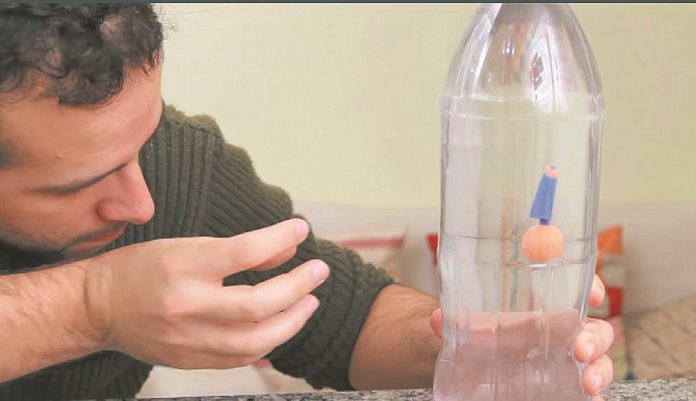 Veja que, se apertar a garrafa com a mão, o submarino desce, e quando largar, ele sobe.