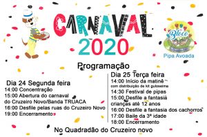 O aquecimento para o Bloco Cachorrão e Pipa Avoada vão começar nesse Sábado dia 15 de Fevereiro á parti das 13 horas. Quem compra o abada no valor de R$ 35,00 reais tem direito a uma deliciosa Feijoada acompanhada de um bom samba,do grupo de pagode tocando os melhores sucessos, adquira seu abada locais de venda Bar Jetequibar na quadra 1205 Quadradão Cruzeiro Novo. No domingo a folia vai ser no Bar do Mazinho a parti das 14 horas ao lado da 3 DP do Cruzeiro velho. Lembrando que o bloco sai dia 24 com desfile de adultos e dia 25 com desfile de crianças e de cachorros juntamento com o baile da melhor idade.