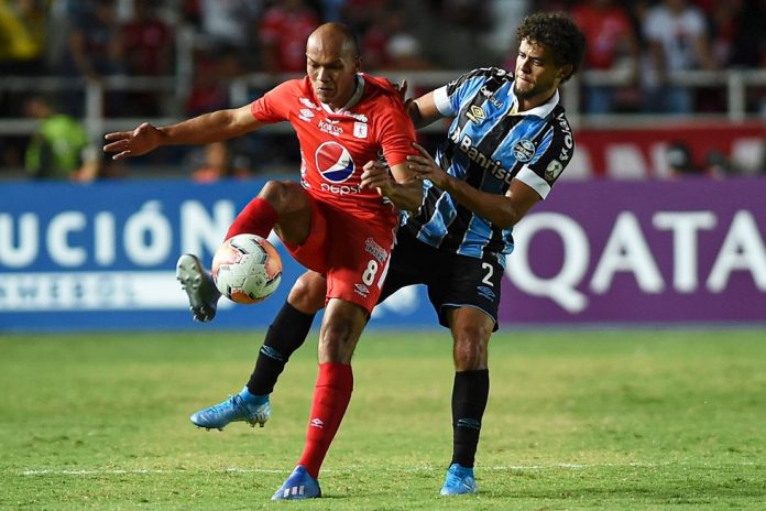 Mas não marcou e foi pressionado nos minutos finais, sofrendo em jogadas aéreas, tanto que Sierra perdeu duas oportunidades de cabeça. Na melhor chance do time colombiano, aos 42 minutos, Pisano cortou dois gremistas e bateu colocado, acertando a trave em ótima jogada individual.