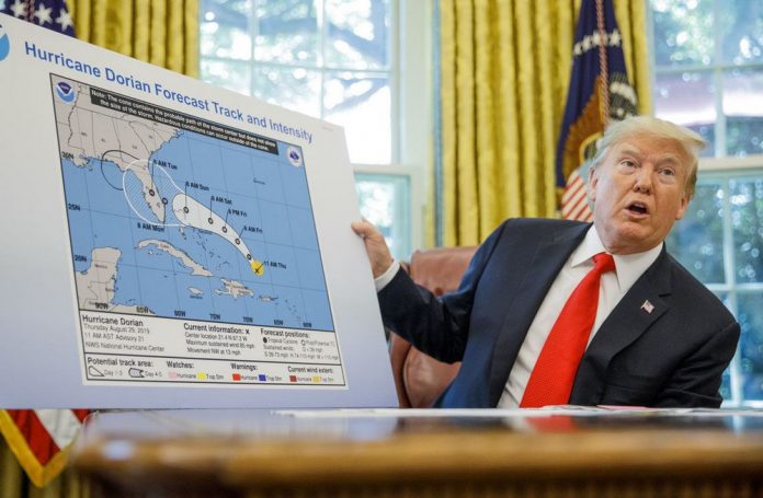 Trump exibe o mapa (emendado) da trajetória prevista do furacão Dorian, contrariando os informes do Serviço Nacional de Meteorologia dos EUA.