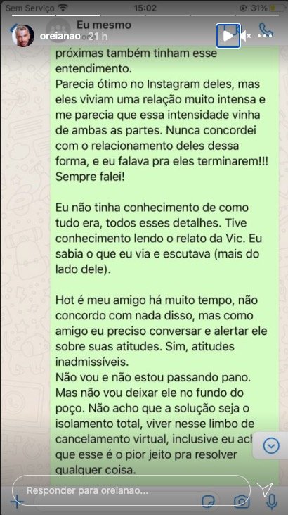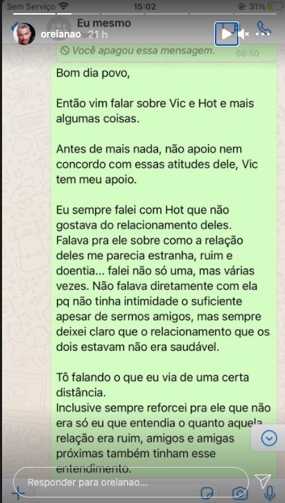 “Vic tem meu apoio. Eu sempre falei com Hot que não gostava do relacionamento deles. Falava para ele sobre como a relação deles me parecia estranha, ruim e doentia… falei não só uma, mas várias vezes. Não falava diretamente com ela, porque não tinha intimidade o suficiente, apesar de sermos amigos. Mas sempre deixei claro que o relacionamento que os dois estavam não era saudável”, escreveu Oreia em uma rede social.