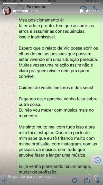 Agora ex-parceiro de Hot, Oreia fez o anúncio do fim da dupla ao se posicionar sobre o caso. Ele afirmou que não compactua com as atitudes do amigo e que apoia Vic Carvalho e ainda revelou que não gostava do relacionamento entre os dois, classificando o namoro como “estranho, ruim e doentio”.