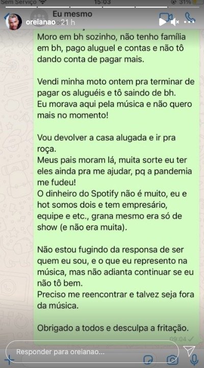 Por fim, Oreia revelou que pretende voltar para o interior de Minas Gerais, onde os pais moram. O rapper afirmou que estava passando por dificuldades em Belo Horizonte e precisou vender uma moto para pagar o aluguel. “Preciso me reencontrar e talvez seja fora da música”, concluiu.