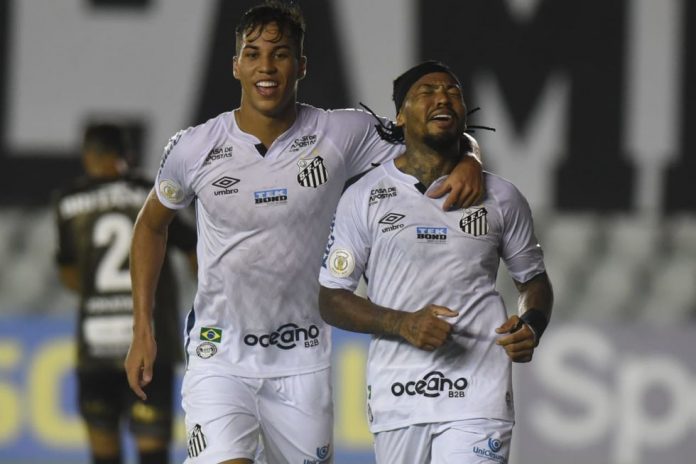 Marinho (dir.) espantou zica e abriu o placar na Vila Belmiro. Crédito da foto: Ivan Storti / Santos FC (13/2/2021)