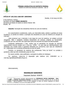 Preocupado com os profissionais e estudantes que precisam trabalhar na “linha de frente” do combate à pandemia, o deputado distrital Reginaldo Sardinha (Avante) protocolou nesta segunda-feira(15), um ofício ao secretário de Estado de Saúde do Distrito Federal, Osnei Okumoto, solicitando a inclusão dos estudantes do curso de medicina que estão no internato no grupo prioritário para vacinação contra a COVID-19.