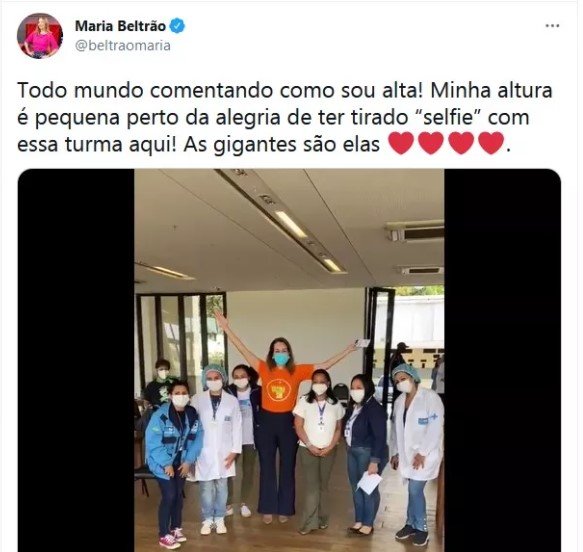 Ao ver que sua altura virou assunto no Twitter, Maria Beltrão voltou a atenção da internet para os especialistas do SUS. “Todo mundo comentando como sou alta! Minha altura é pequena perto da alegria de ter tirado ‘selfie’ com essa turma aqui! As gigantes são elas”, concluiu.