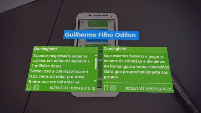 No celular, havia cerca de 900 caixas de diálogos. A um contato de nome Guilherme Filho Odilon, Dominguetti enviou a seguinte mensagem: “Estamos negociando algumas vacinas em número superior a 3 milhões de doses. Nesse caso, a comissão fica em 0,25 centavos de dólar por dose. O que estamos fazendo é pegar o volume da comissão e dividir de forma igual a todos os envolvidos”. À CPI, ele havia comentado um valor menor como comissão, de US$ 0,20.