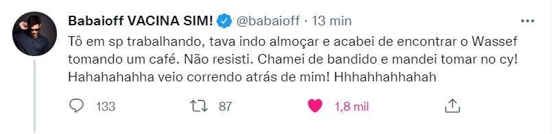 “Estou em São Paulo trabalhando, estava indo almoçar e acabei de encontrar o Wassef tomando um café. Não resisti. Chamei de bandido e mandei tomar no ‘cy’! Veio correndo atrás de mim”, afirmou o global, em publicação no Twitter.
