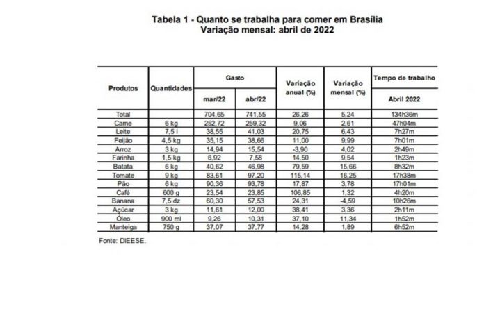 Segundo o Departamento, o valor da cesta básica aumentou em todas as capitais brasileiras. No ranking do aumento entre março e abril, Brasília ocupou a sexta posição, ficando atrás de Campo Grande (6,42%), Porto Alegre (6,34%), Florianópolis (5,71%), São Paulo (5,62%) e Curitiba (5,37%).
