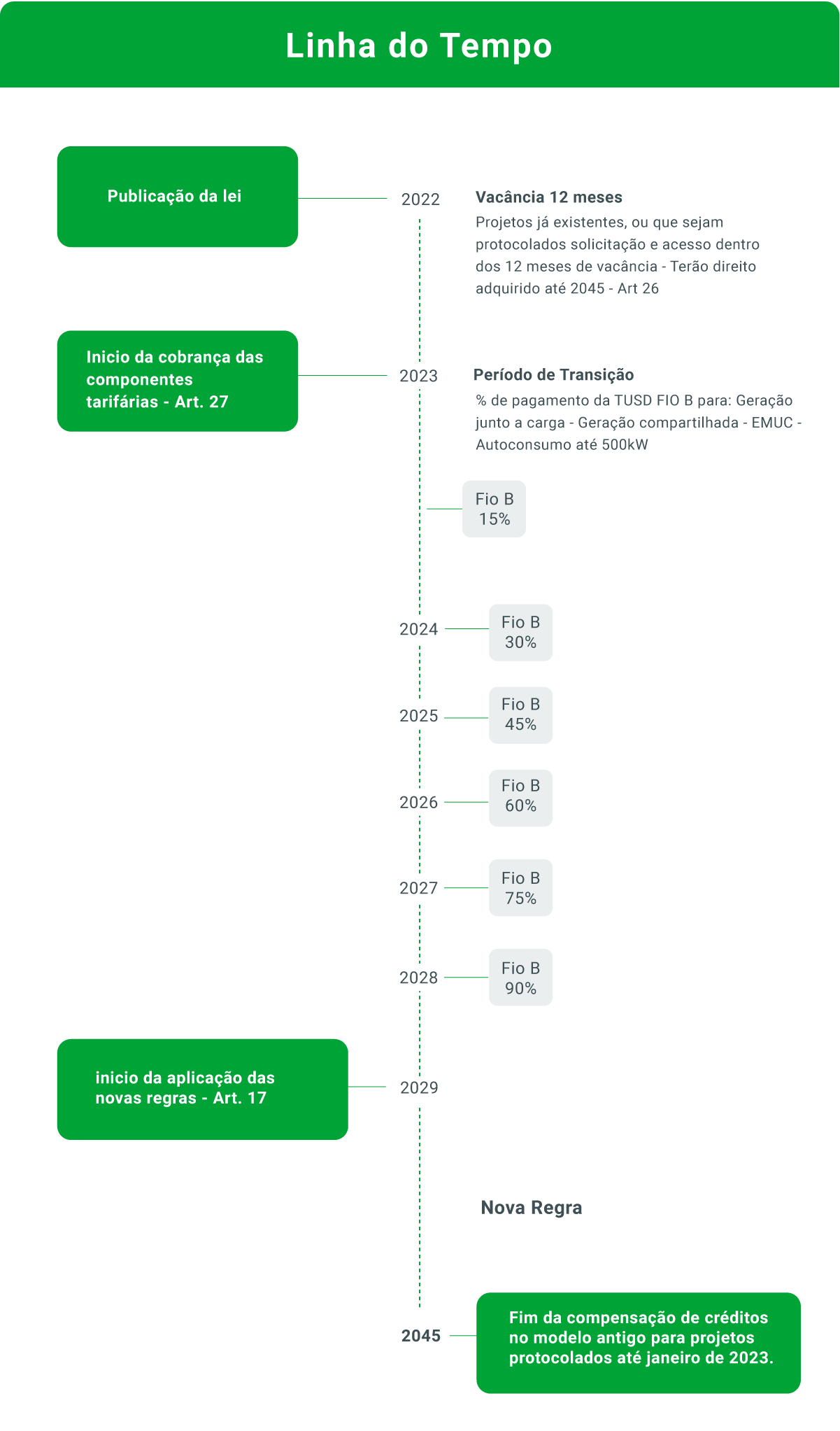 Com isso, caso a Joel e Mônica optem por instalar o sistema fotovoltaico em 2023, deverão pagar 15% da taxa aumentando mais 15% no ano seguinte e assim sucessivamente.