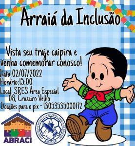 Neste sábado, dia 2 de julho, a partir das 15h, teremos o Arraial da Inclusão, uma parceria da ARUC com a ABRACI, entidade que atende crianças e jovens autistas do DF. A Festa será adaptada para as crianças que não podem lidar com som alto, mas teremos a venda de muitas comidas típicas. A festa acontece no Salão Nilton Sabino na sede da ARUC.