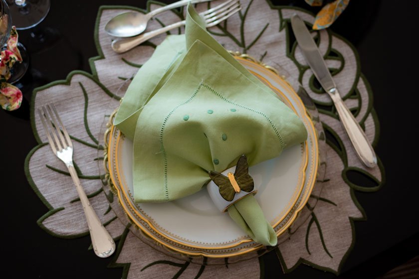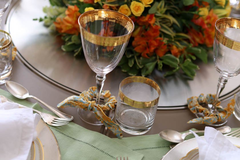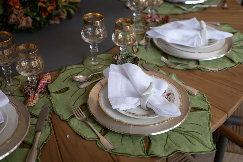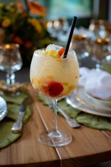 Em tons de verde, as mesas postas ganharam adornos, como porta-guardanapos, que simbolizavam o novo momento. Atrás, um bar repleto de drinques refrescantes preparados com frutas da estação marcava presença. Mas também não faltaram vinhos de rótulos premiados para brindar.