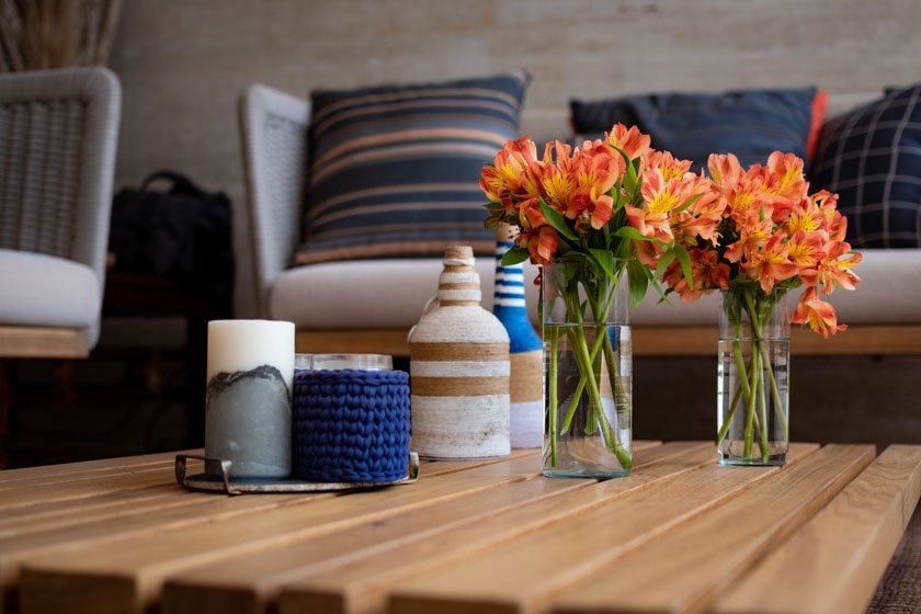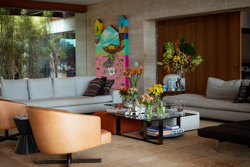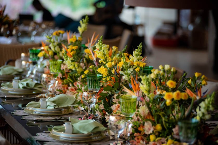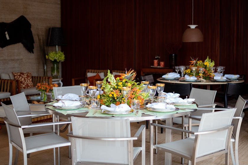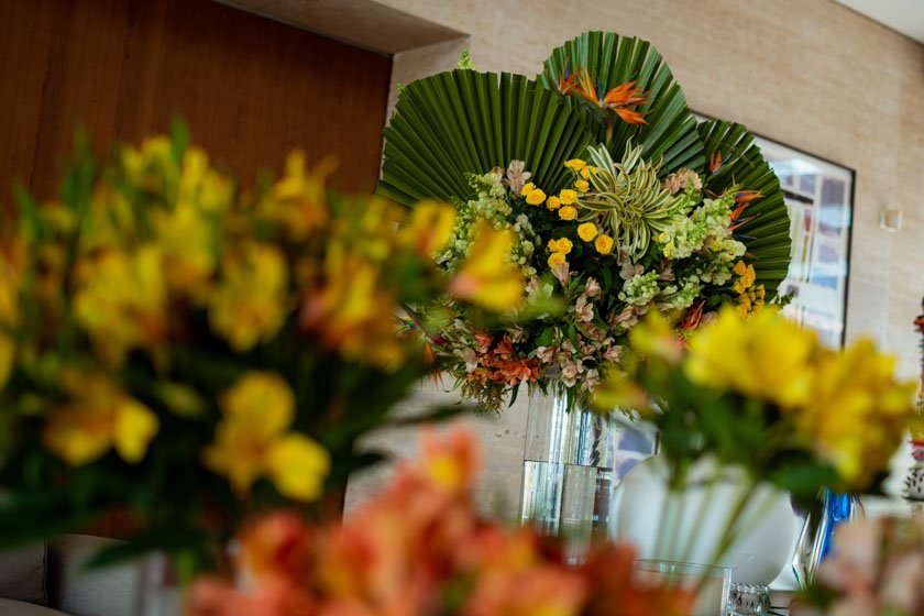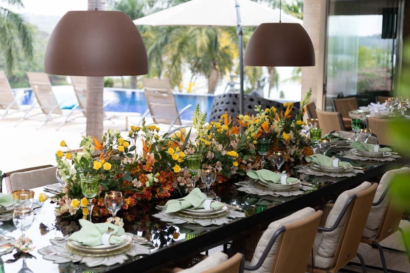 As flores, em especial as astromélias, e folhas também ocuparam arranjos espalhados pelos ambientes. Eles, por si só, eram um espetáculo à parte. O visual único que parte da piscina da casa em direção ao Lago Paranoá completou o cenário da celebração. É de suspirar!