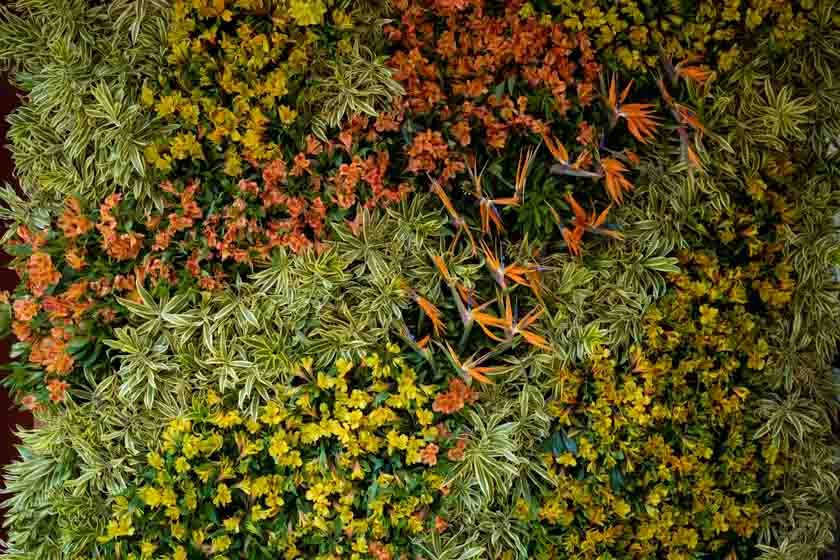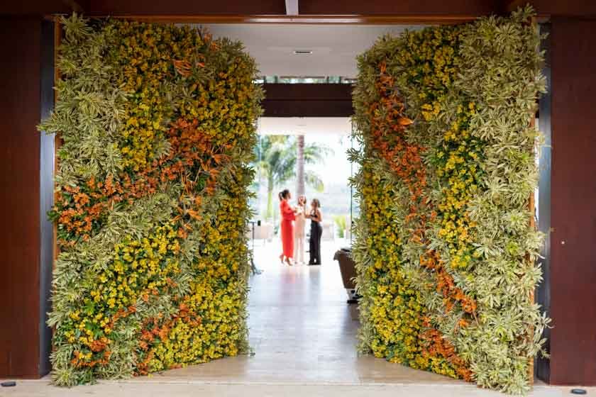 Já na entrada, a porta principal foi embelezada com folhagens, elemento natural que também integrou um painel vivo na sala, onde muitas das fotos eram tiradas e o faziam de plano de fundo.