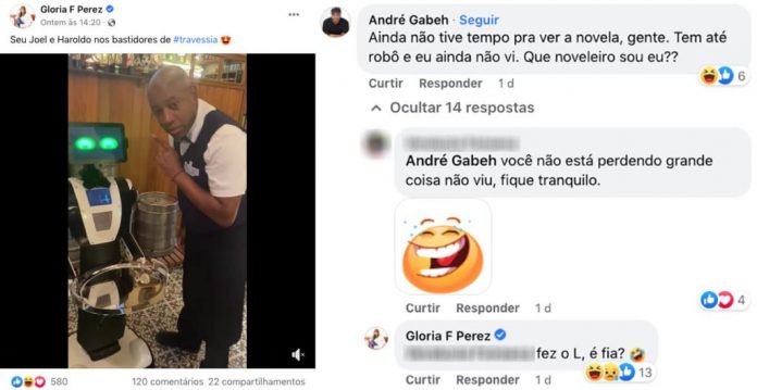 O ex-BBB André Gabeh escreveu: “Ainda não tive tempo pra ver a novela, gente. Tem até robô e eu ainda não vi. Que noveleiro sou eu?”. Uma telespectadora ironizou: “Você não está perdendo grande coisa, não, viu, fique tranquilo”.