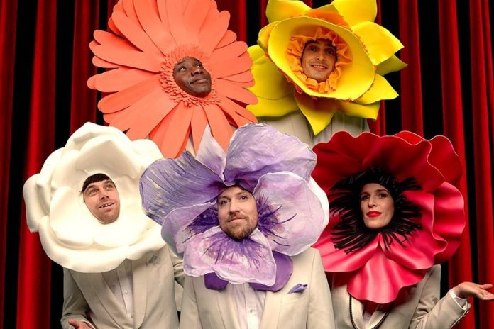 Integrantes da banda inglesa Metronomy com flores gigantes na cabeça – Metrópoles