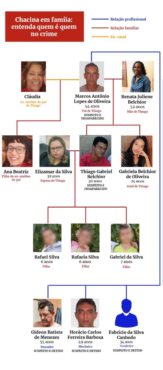 De acordo com o delegado responsável pelo caso, Ricardo Viana, a linha de investigação agora sugere que os quatro membros da família que seguem desaparecidos não teriam envolvimento na morte da cabeleireira Elizamar da Silva, de 39 anos, os três filhos, a sogra e cunhada dela.
