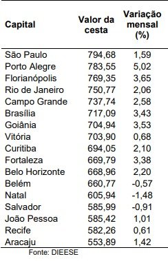 Os 13 produtos da cesta básica são: açúcar refinado, arroz agulhinha, banana, batata, café em pó, carne bovina de primeira, farinha de trigo, feijão carioquinha, leite integral, manteiga, óleo de soja, pão francês e tomate.