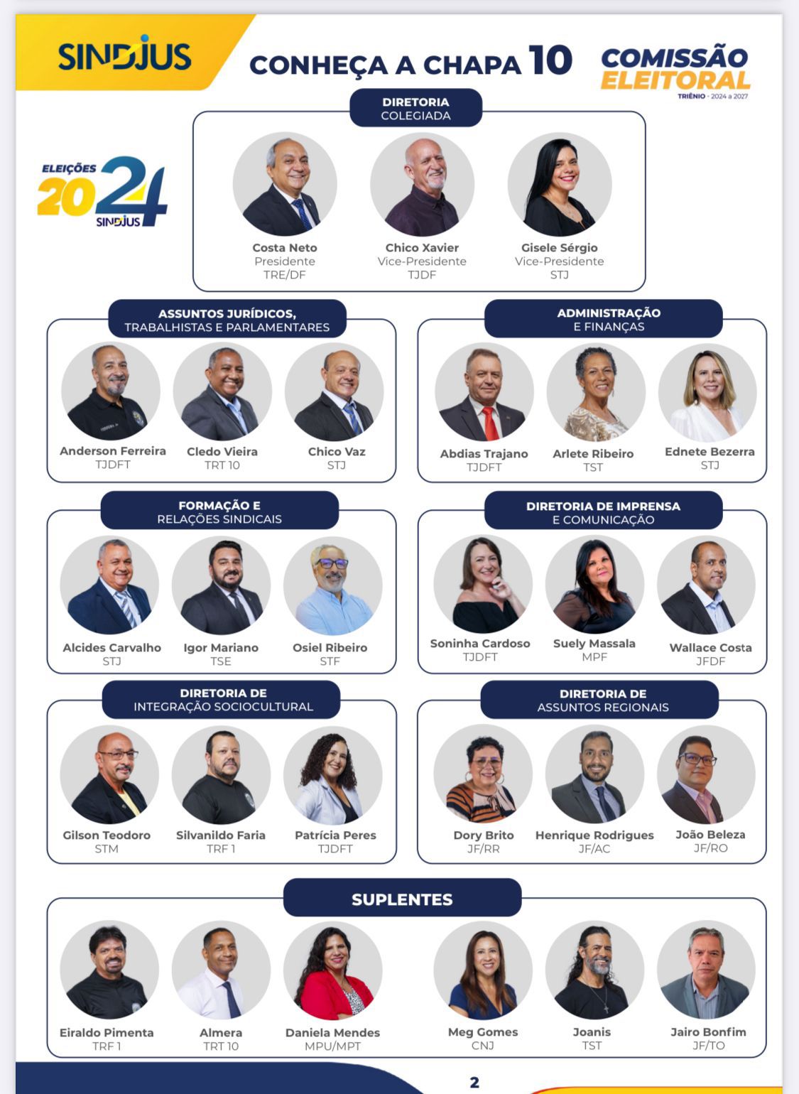 Com vitória esmagadora, a Chapa 10, presidida pelo presidente Costa Neto, é reeleita pelo Sindjus DF – Hoje foi realizada a eleição da Diretoria do Sindjus DF. Como resultado final do primeiro dia de apuração, foi matematicamente reeleita a chapa 10, encabeçada pelo presidente Costa Neto com uma votação de 2049 votos contra 1050 da chapa 20. Uma diferença de quase mil votos!