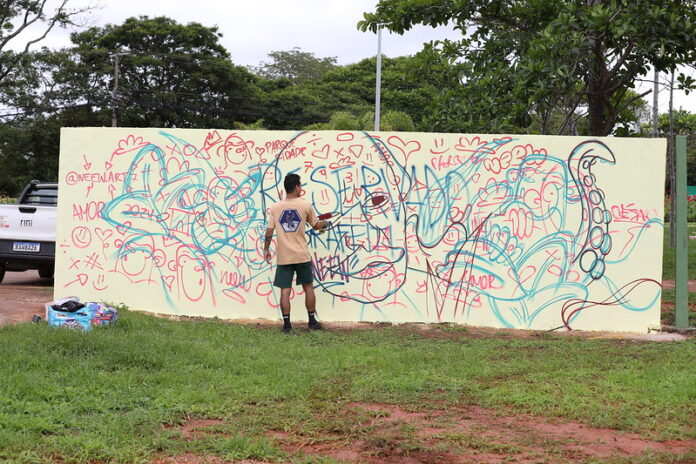 Neew, artista do grafite: “A ideia é essa, pegar um espaço que está abandonado, sujo, e que é importante de Brasília, e deixar algo bonito para a cidade” | Foto: Matheus H. Souza/Agência Brasília