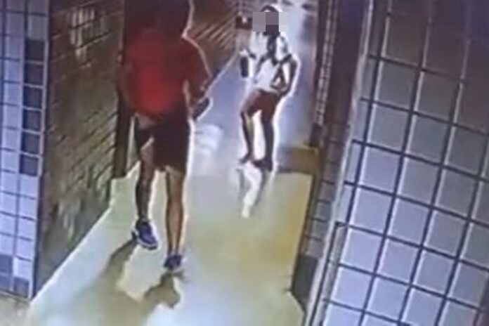 Câmeras registraram o momento em que o suspeito chega correndo no prédio, antes da invasão. As imagens flagraram o instante em que uma vítima, após encontrar o homem, foge e segura a porta da portaria para impedir a saída do suspeito.