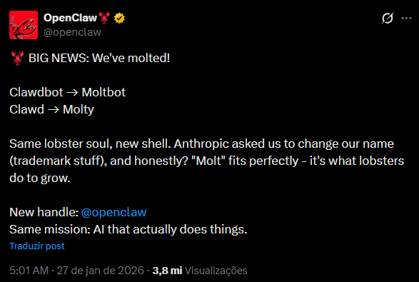 Quando o projeto ganhou visibilidade pública em janeiro de 2026, a Anthropic tomou conhecimento do nome e solicitou a mudança para evitar uma possível disputa de marca. Em resposta rápida e após um brainstorm com a comunidade, o projeto foi rebatizado como Moltbot, nome anunciado oficialmente em 27 de janeiro.