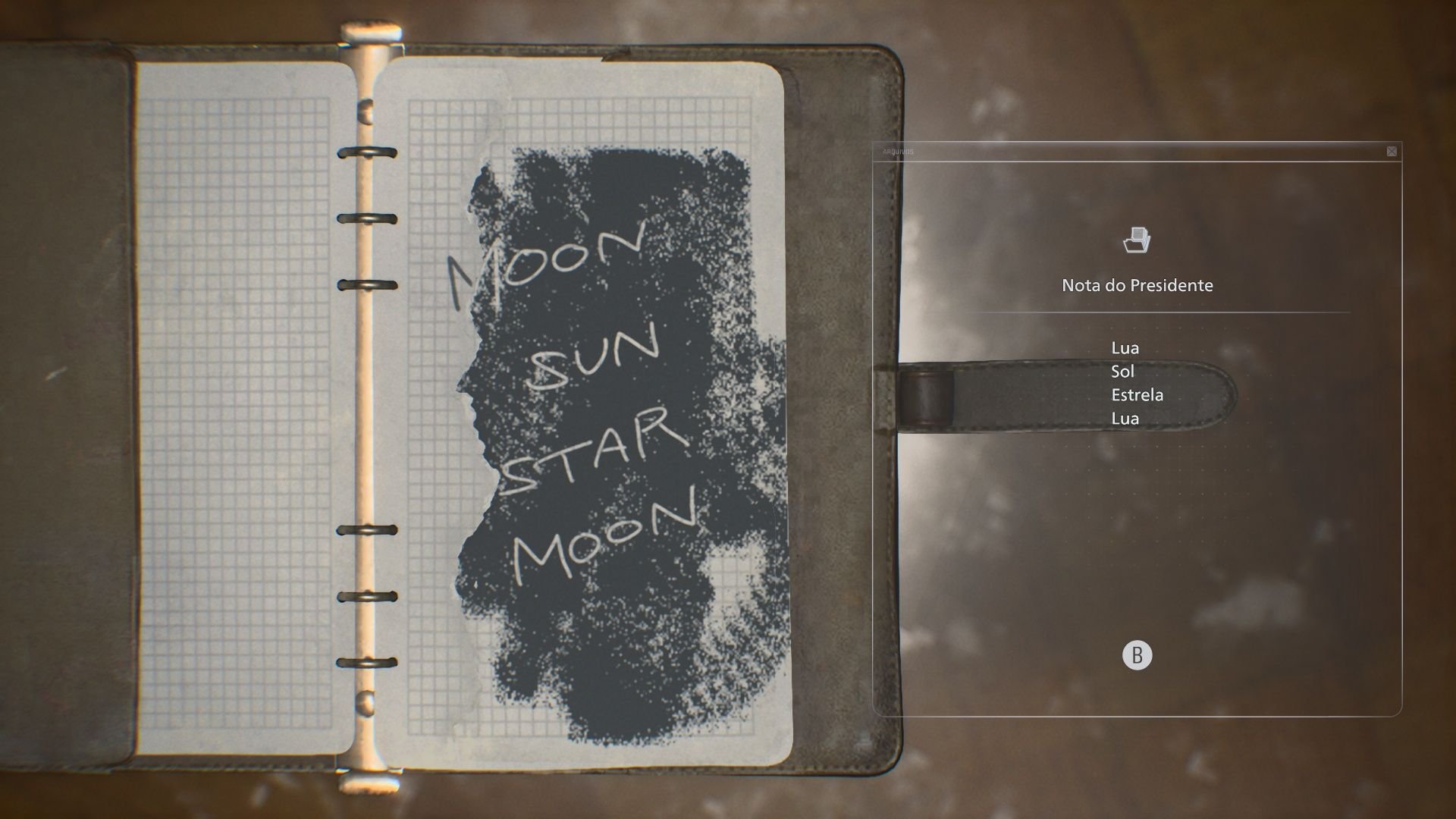 Para descobrir a combinação correta, pegue o lápis na mesa principal e use-o no caderno que está na mesa de centro. Ao rabiscar as páginas, a solução será revelada.