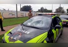 No vídeo é possível ver os vidros dianteiro e traseiro totalmente danificadosO que seria uma simples abordagem de trânsito se transformou em um caso...
